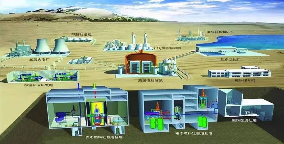 釷基熔鹽堆具有多重技術(shù)優(yōu)勢,使用高溫熔鹽作為冷卻劑,具有高溫、低壓、高化學(xué)穩(wěn)定性、高熱容等熱物特性;無需使用沉重而昂貴的壓力容器,適合建成緊湊、輕量化和低成本的小型模塊化反應(yīng)堆;熔鹽堆采用無水冷卻技術(shù),只需少量的水即可運行,可在干旱地區(qū)實現(xiàn)高效發(fā)電;熔鹽堆輸出溫度可達七百攝氏度以上,既可用于發(fā)電,也可用于工業(yè)熱應(yīng)用、高溫制氫以及氫吸收二氧化碳制甲醇等,實現(xiàn)核能綜合利用。
