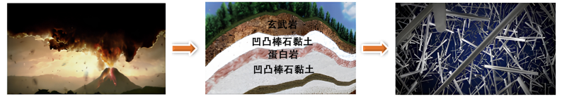 凹凸棒石的“分子身份證號”為Si8Mg5O20(OH)2(H2O)4·4H2O。它誕生于白堊紀(jì)至第三紀(jì)漫長的地質(zhì)演化過程中,是火山沉積、熱液蝕變與漫長風(fēng)化共同孕育的結(jié)晶。歷經(jīng)億萬年錘煉形成的獨特結(jié)構(gòu),至今仍是人類難以合成的自然杰作。
