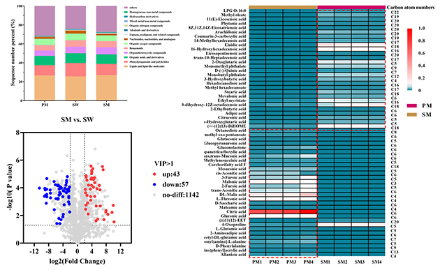 非靶向代謝組學分析共鑒定出1242種代謝物。在扁蓿豆植株甲醇提取物中,短鏈有機酸及其衍生物的相對豐度較高;根際土壤水提物中富含生物堿和黃酮類化合物;而根際土壤甲醇提取物則以長鏈有機酸及其衍生物為主。進一步發(fā)現,短鏈有機酸、其衍生物以及黃酮類化合物可能為與扁蓿豆化感作用相關的關鍵候選化感物質。