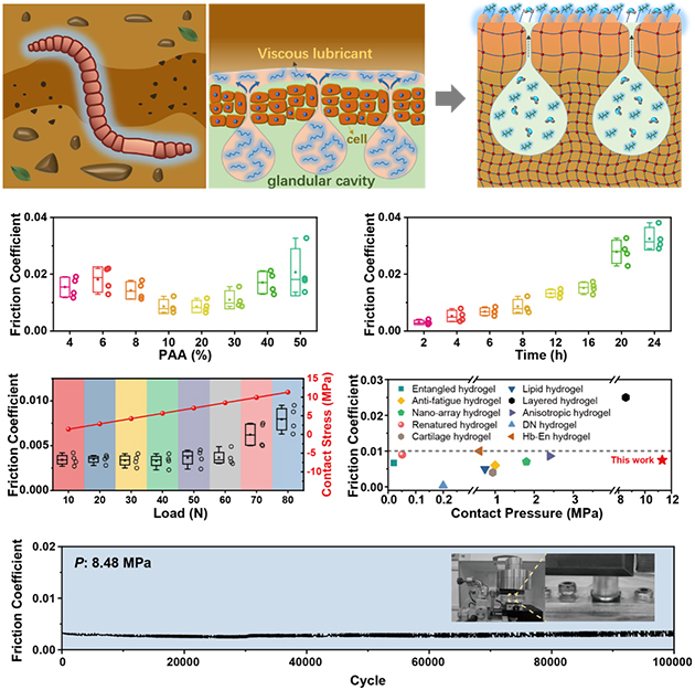 中國(guó)科學(xué)院蘭州化學(xué)物理研究所潤(rùn)滑材料全國(guó)重點(diǎn)實(shí)驗(yàn)室周峰研究員和麻拴紅研究員團(tuán)隊(duì),受自然界蚯蚓持續(xù)潤(rùn)滑機(jī)制啟發(fā),開(kāi)發(fā)了一種基于微量潤(rùn)滑劑的聚合物凝膠超潤(rùn)滑材料。