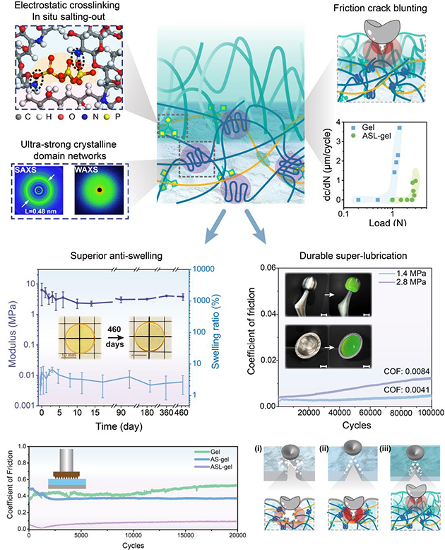 在解決聚合物凝膠材料超高承載和機(jī)械魯棒性超潤(rùn)滑難點(diǎn)基礎(chǔ)之上,研究人員將關(guān)注點(diǎn)轉(zhuǎn)移到解決材料在苛刻鹽離子介質(zhì)中的長(zhǎng)效力學(xué)穩(wěn)定性難題。盡管已報(bào)道的大多數(shù)聚合物凝膠材料能夠?qū)崿F(xiàn)優(yōu)異的承載與減摩功能,但其在復(fù)雜離子介質(zhì)中普遍存在溶脹和力學(xué)失效問(wèn)題,摩擦學(xué)評(píng)價(jià)往往以去離子水為潤(rùn)滑介質(zhì),這明顯與聚合物材料的實(shí)際應(yīng)用工況不符(海水或生理介質(zhì)),使得相關(guān)材料的開(kāi)發(fā)僅僅停留在概念和模型水平。