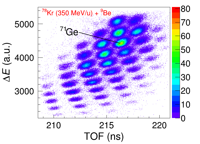 圖2:350 MeV/u氪-78束流轟擊10 mm厚的鈹靶,RIBLL2束線磁剛度按目標(biāo)核鍺-71設(shè)置時(shí),氪-78碎裂