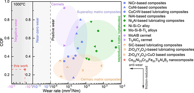 圖2. 各類已報道高性能抗磨材料在1000 ℃的摩擦學(xué)性能對比