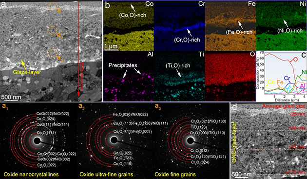 近日,中國科學(xué)院蘭州化學(xué)物理研究所潤滑材料全國重點實驗室高溫摩擦學(xué)課題組與香港城市大學(xué)機械工程系先進(jìn)結(jié)構(gòu)材料課題組,在長期合作基礎(chǔ)上提出了一種基于晶體-非晶異質(zhì)結(jié)構(gòu)與梯度納米氧化層協(xié)同調(diào)控的高熵納米復(fù)合材料設(shè)計策略。團(tuán)隊設(shè)計制備了一種Co25Ni23Cr20Fe20Ti6Al4B2高熵納米復(fù)合材料,包含高密度Ti–O富集非晶納米析出相的多級異質(zhì)結(jié)構(gòu)。在1000 ℃和較高接觸應(yīng)力條件下,該材料表面原位生成微米級厚度的梯度納米釉質(zhì)層,其晶粒尺寸沿深度方向從表面25nm漸增至基體112nm,實現(xiàn)了應(yīng)變逐層協(xié)調(diào)與應(yīng)力有效緩解。得益于這一結(jié)構(gòu)演化,該材料在1000 °C實驗中獲得了-2.3×10-6mm3/Nm的穩(wěn)定負(fù)磨損率與0.26的低摩擦系數(shù),刷新了金屬基抗磨材料的高溫性能紀(jì)錄。