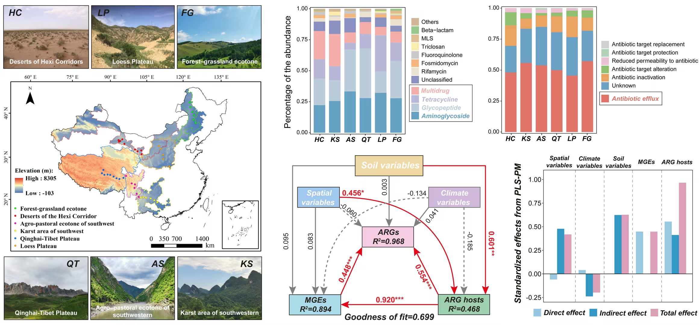 中國(guó)科學(xué)院西北生態(tài)環(huán)境資源研究院李玉強(qiáng)研究員團(tuán)隊(duì)在我國(guó)4300公里的范圍內(nèi),針對(duì)森林、草原、沙漠等六類(lèi)典型陸地自然生態(tài)系統(tǒng),設(shè)立了42個(gè)采樣點(diǎn),運(yùn)用宏基因組學(xué)方法,系統(tǒng)揭示了表層土壤中ARGs的分布特征與傳播機(jī)制。