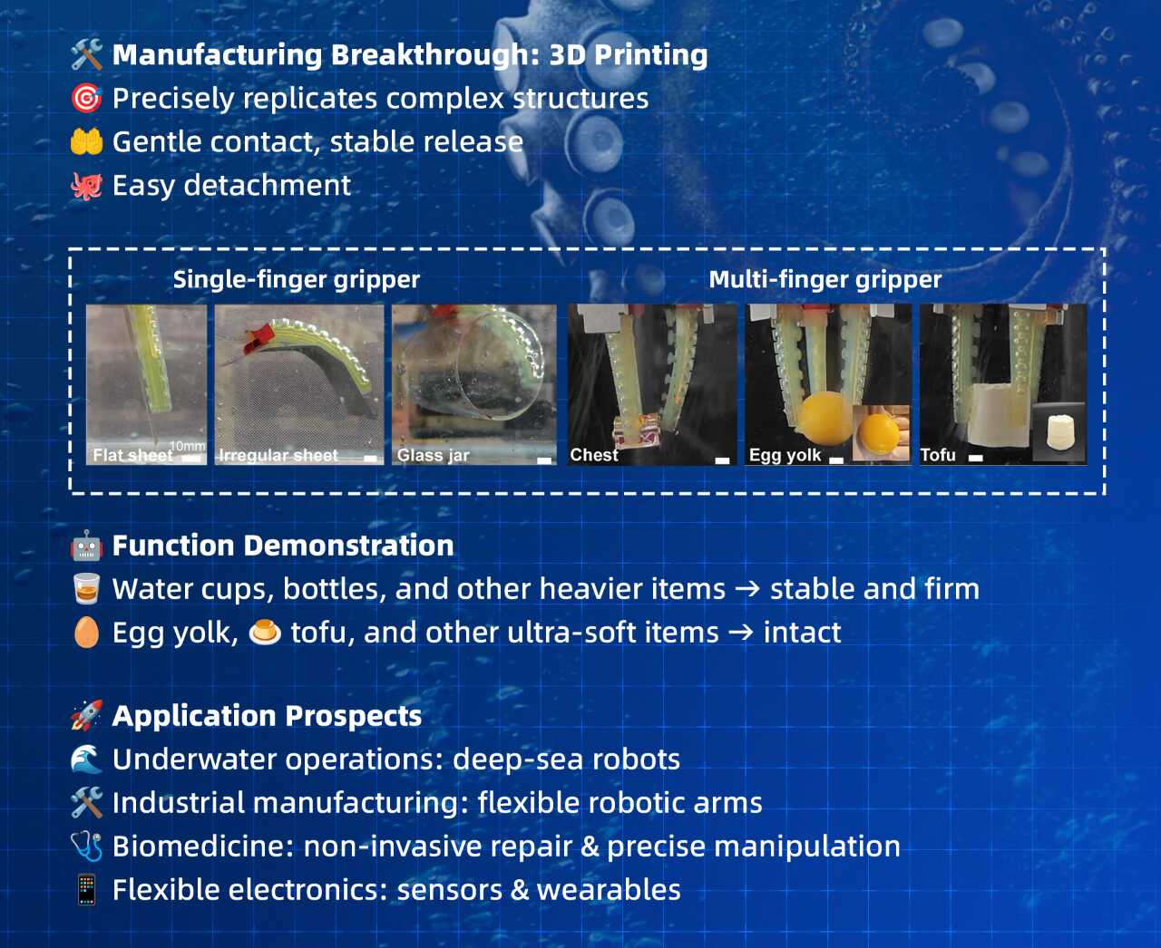 這款仿生吸盤可以裝在機械臂上,穩(wěn)穩(wěn)夾起豆腐、蛋黃等超軟物體而不損傷。它的應用前景廣泛:在深海探測中抓取脆弱生物樣本,在醫(yī)療領域用于非侵入性貼附或手術輔助,在柔性制造中搬運精密零件。