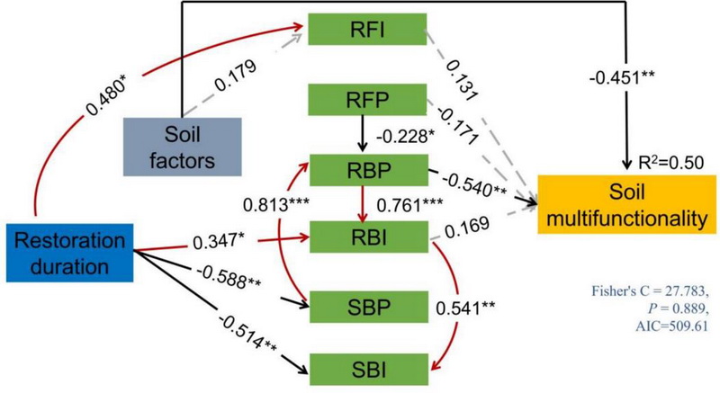 中國科學(xué)院西北高原生物研究所高寒濕地生態(tài)系統(tǒng)近自然修復(fù)與功能提升研究團隊研究基于不同恢復(fù)年限(0-50年)的檸條人工林,揭示了土壤和根際微生物群落對土壤多功能性的驅(qū)動機制。結(jié)果顯示,隨著恢復(fù)年限增加,尤其恢復(fù)至35年與50年時,土壤多功能性顯著提升;細菌OTU豐富度與土壤多功能性呈顯著正相關(guān),而多樣性如Shannon和Pielou指數(shù)表現(xiàn)出負相關(guān);真菌豐富度(OTU、Chao1)均與多功能性強正相關(guān)。結(jié)構(gòu)方程模型表明,土壤因子對多功能性具有直接負向影響,根際細菌群落組成的變化是重要間接調(diào)節(jié)路徑。類似地,在三江源地區(qū)高寒草地中,由于近21%的草地已出現(xiàn)輕度退化,若缺乏修復(fù)措施,極可能在氣候變化與放牧壓力下進一步演變?yōu)椤昂谕翞薄T谶@一背景下,氮素添加作為最常見的草地修復(fù)措施,能夠在短期內(nèi)緩解氮限制、提高生產(chǎn)力。然而,隨著氮素添加持續(xù)時間的增加,草地生態(tài)系統(tǒng)往往出現(xiàn)土壤酸化、植物多樣性下降等負面效應(yīng)。結(jié)果表明,氮素添加的生態(tài)效應(yīng)取決于持續(xù)時間,以及氮素水平和類型;長期添加氮素會通過促進禾本科植物生長并抑制非優(yōu)勢物種的生長,從而降低物種多樣性;氮添加通過物種更替改變生物多樣性和多功能性關(guān)系。這些發(fā)現(xiàn)強調(diào)了在脆弱生態(tài)系統(tǒng)管理中,應(yīng)關(guān)注演替進程與外源干擾對群落組成和功能維持的雙重影響,從而為制定更精細化、長期有效的生態(tài)修復(fù)和可持續(xù)管理策略提供科學(xué)依據(jù)。