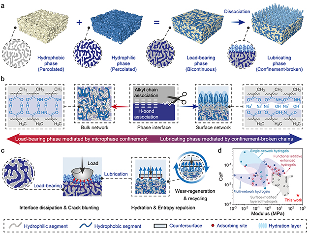 在人體關(guān)節(jié)中,軟骨依托多尺度膠原網(wǎng)絡(luò)、多相組分及其界面的協(xié)同作用,構(gòu)建出兼具高承載與超低摩擦的天然潤滑系統(tǒng)?;谶@一特性,水凝膠作為有潛力的人工軟骨替代材料備受關(guān)注。然而,傳統(tǒng)潤滑水凝膠往往因結(jié)構(gòu)均一性而陷入兩難境地,提高整體網(wǎng)絡(luò)致密度雖能增強(qiáng)力學(xué)性能,卻會(huì)削弱表面水合與潤滑能力;單純追求低摩擦,又會(huì)使材料在高載荷下迅速變形、蠕變甚至失效。這種長期存在的性能權(quán)衡,嚴(yán)重制約了水凝膠在高載荷、長壽命潤滑場景中的實(shí)際應(yīng)用。