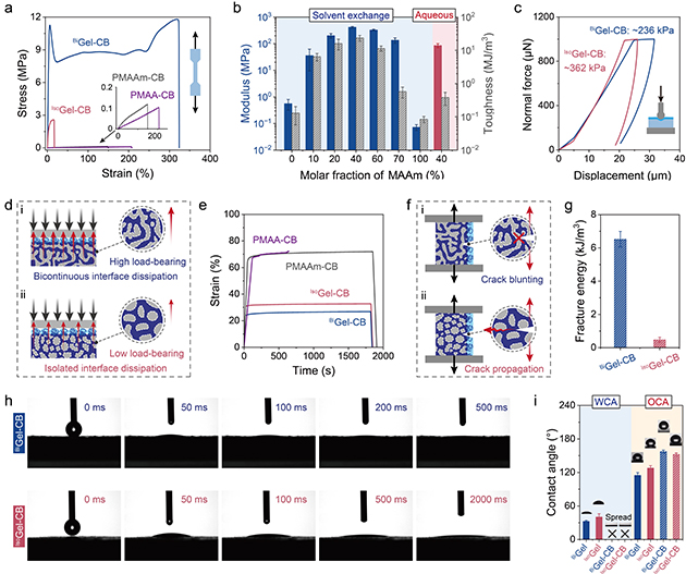 圖3. (a) 不同水凝膠的單軸拉伸應(yīng)力-應(yīng)變曲線。(b) 楊氏模量和韌性與MAAm含量的關(guān)系。(c) 表面納米壓痕測試曲線。(d) 抗蠕變性能測試示意圖及(e)蠕變曲線。(f) 純剪切測試示意圖及(g)斷裂能結(jié)果。(h) 水滴在BiGel-CB和IsoGel-CB表面的動(dòng)態(tài)鋪展過程。(i)?超親水及水下超疏油性能評估。